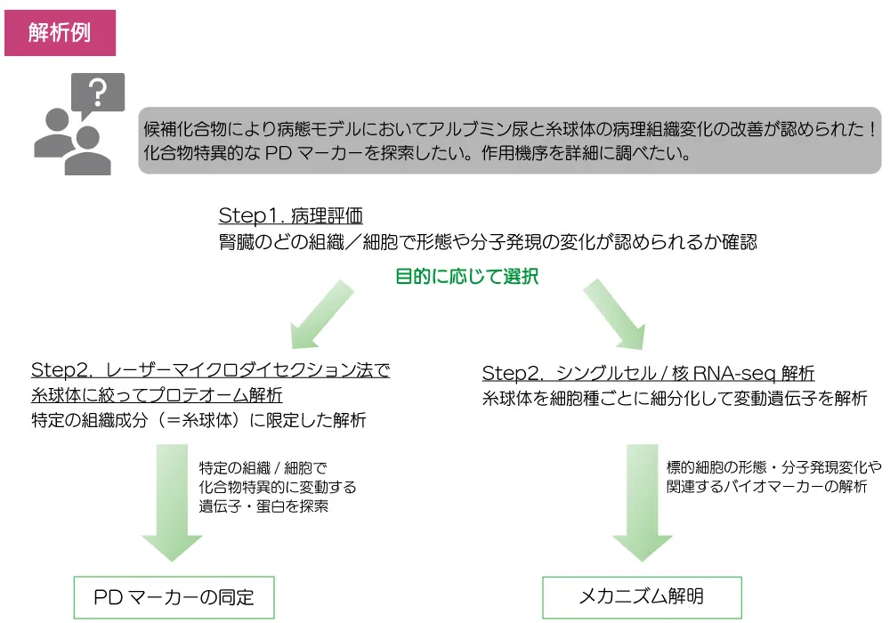 様々な手法を駆使して専門の研究者が複雑な腎組織を読み解くことで、薬効・毒性メカニズムの解析、PDマーカー含むバイオマーカーの同定などお客様の課題解決をサポートします!