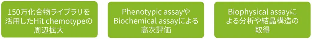 HT-ASMSで見出されたヒット化合物について、Hit expansion、各種プロファイリングを行うことで、