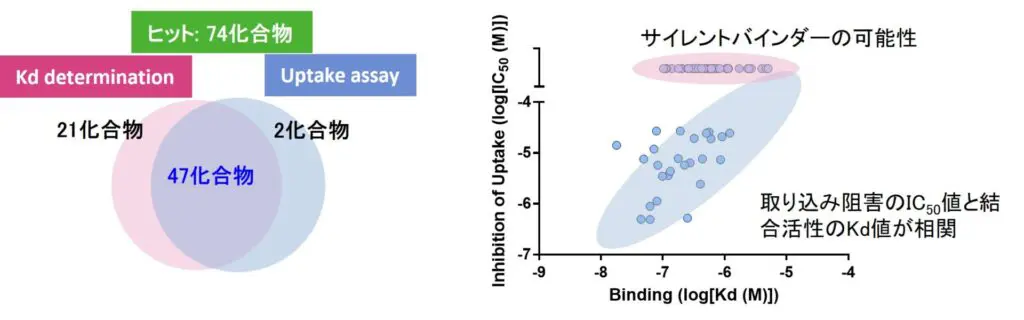 また、Kd 値が算出された68 化合物のうち47 化合物は取り込み阻害活性を示しました。