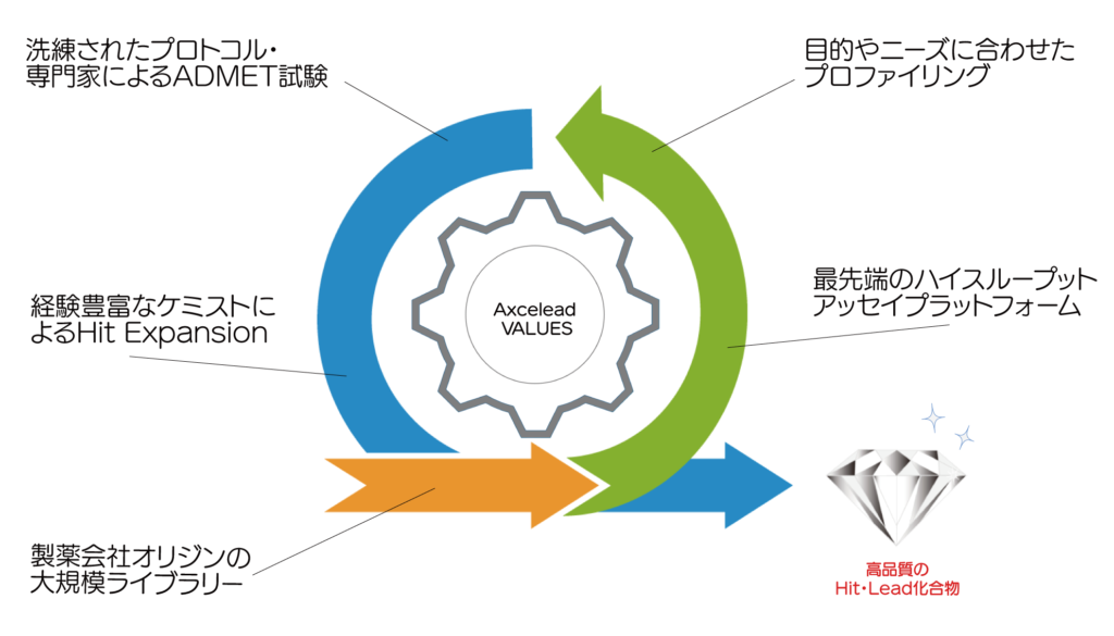 日比野:ライブラリーも重要ですね。Axceleadの化合物ライブラリーは非常に充実していて、ダイバーシティーと質の高い150万以上の化合物の中から、お客様がご希望のターゲットと想定されるMOAに適したライブラリーを厳選してご提案することができます。さらに、ランダムスクリーニングに加えて、in silico創薬技術を用いてバーチャルスクリーニングを付加することも可能です。