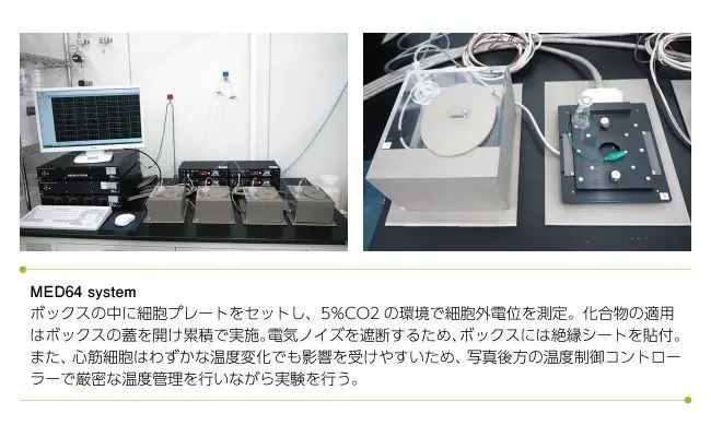 これは心電図のQT間隔が伸びるか伸びないかを予測するためのアッセイです。通常、in vitroでhERG K+チャネルの阻害が見られたら、次の段階としてイヌやサルの心電図実験でQT間隔の延長があるかを調べます。 ただ、動物実験はやはりコストが高い。そこで、vitroとvivoの間を繋ぐもう一つのin vitro試験として、hiPS心筋細胞を使ったMEAアッセイがあり、ヒト心室筋の興奮を担う活動電位(正式には細胞外電位)を測定できます。この試験を行えば、g単位の化合物を使って百数十万円もの動物心電図実験をやらなくても、試験管の中でQT延長リスクが評価できるんです。