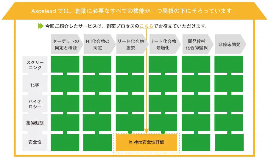 - 開発Go/No go decisionに影響する毒性プロファイルは、研究初期の段階でリスクを回避することが重要