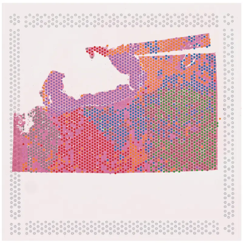 右図において腫瘍組織の各領域が色別にクラスタリングされていることが観察できます。興味ある遺伝子発現の局在性の確認、病理学的に意義のあるスポットに絞った解析なども実施することが可能です。