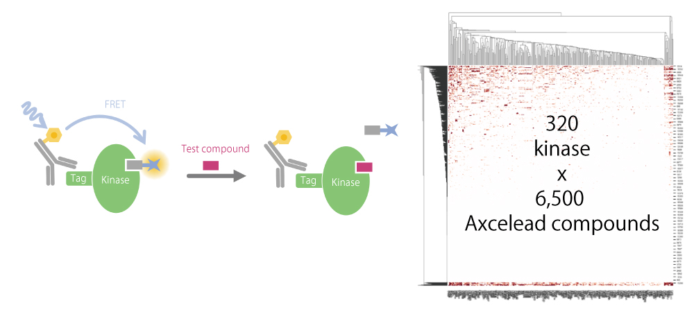 Axceleadのkinase panel試験では、kinase の ATPポケットに結合するオリジナル蛍光プローブ化合物を使ったTR-FRET アッセイによって化合物の結合活性を評価しています。1536 well プレートで試験するハイスループットなアッセイなので、ご希望に応じて絞られた数のターゲットに対してのHTSの実施も可能です。 Axceleadでは5年以上にわたり約320 kinase に対するパネル試験を継続しており、実績として18,000化合物以上の評価を実施してきました。そのうち約6,500化合物はAxceleadが保有する化合物で独自に取得したデータであり、この大規模データを kinase 創薬プラットフォーム構築に活用しています。(お客様の創薬プロジェクトデータは使用しておりません)