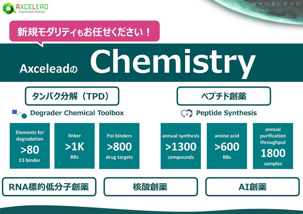 当社は、創薬研究を総合的に支援しており、化合物のデザインから合成、分析・精製、薬理学的および物性学的評価に至るまで、創薬に必要な各種研究をお客様のニーズに応じてワンストップで提供しています。低分子創薬はもとより、近年注目を集める標的タンパク質分解誘導剤(TPD)やペプチド創薬、核酸創薬においても豊富な実績に基づき継続的に技術力を高めています。