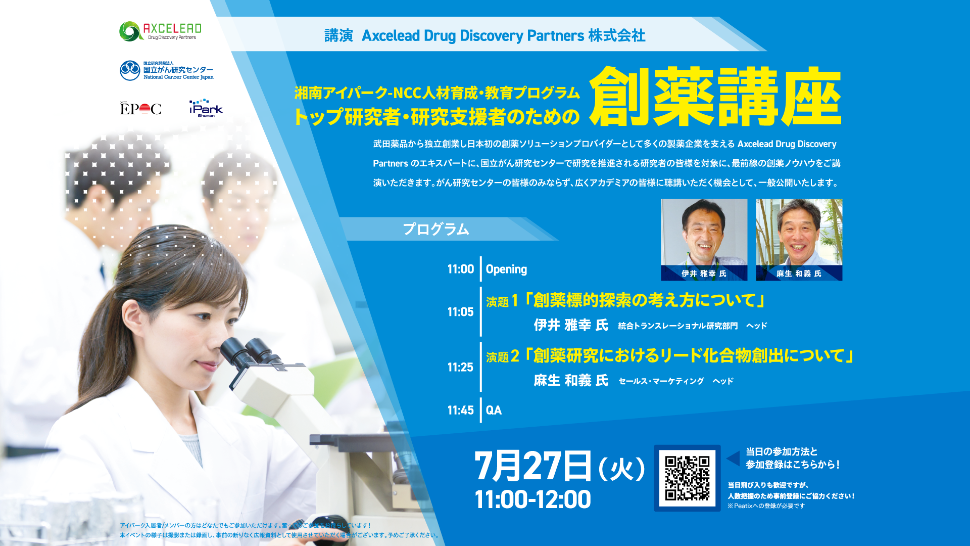 湘南アイパークが主催するイベント「「NCC-EPOC トップ研究者・研究支援者のための創薬講座」で、統合トランスレーショナル研究部門 ヘッドの伊井と、セールス・マーケティング ヘッドの麻生が講演します。 本イベントは、国立がん研究センターで研究を推進されている研究者の皆さま対象に企画されていますが、広くアカデミアの皆さまにご聴講いただけるように一般公開されています。