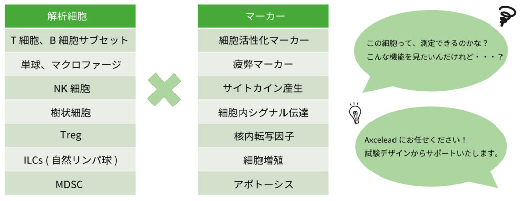 同時に様々な細胞種を検出することが可能です。Axceleadの豊富な経験をもとに、最適な抗体パネルの組み合わせ、解析方法をデザイン・構築し、ご希望の細胞種を解析いたします。