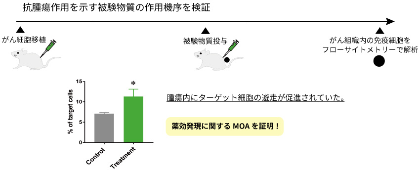 Axceleadでは免疫疾患やがん免疫領域をはじめとして、数多くの病態モデル、薬効評価系を保有しています。これら評価系の生体由来サンプルをフローサイトメトリーで解析することにより、新薬候補物質のPK/PD解析、薬効評価、MOA解析などが可能です。