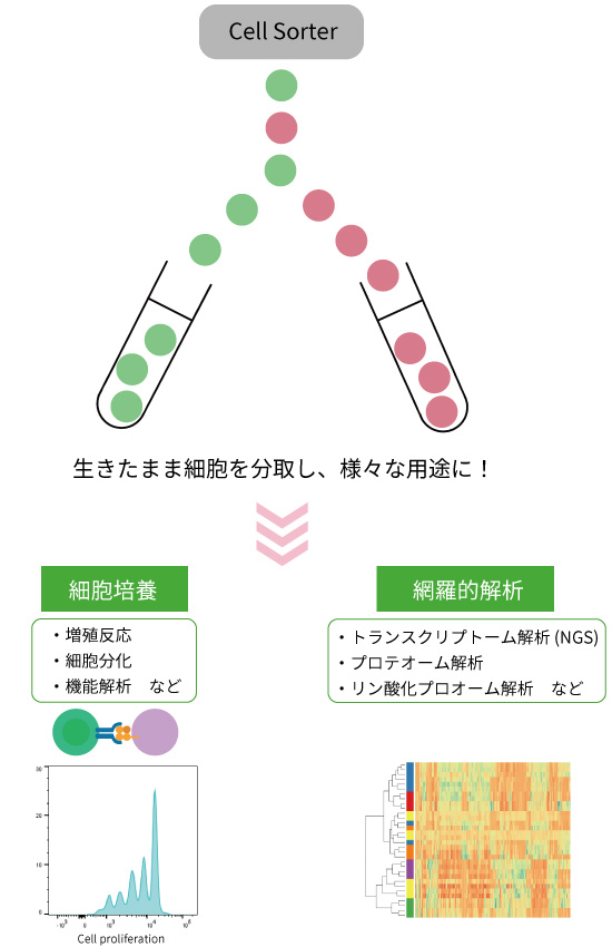 Cell sorterを使用すれば、生きたまま目的細胞を分取することができます。分取した細胞は、培養やRNA-seq解析、オミックス解析などに利用することができ、詳細かつ網羅的な解析が可能になります。