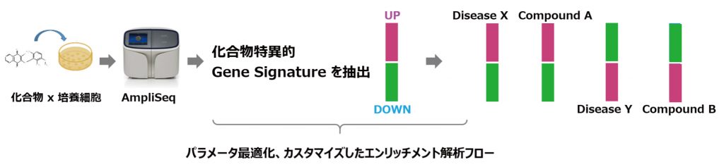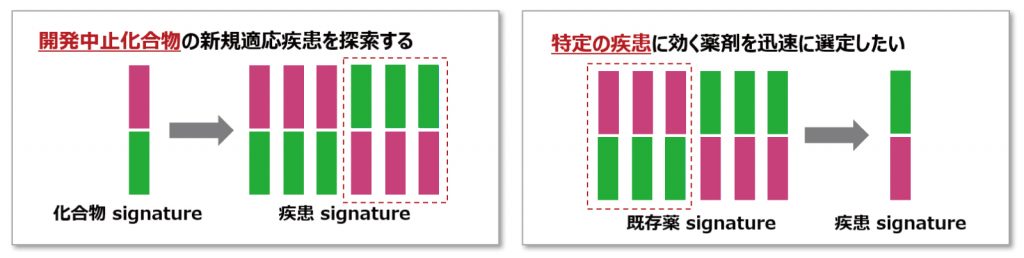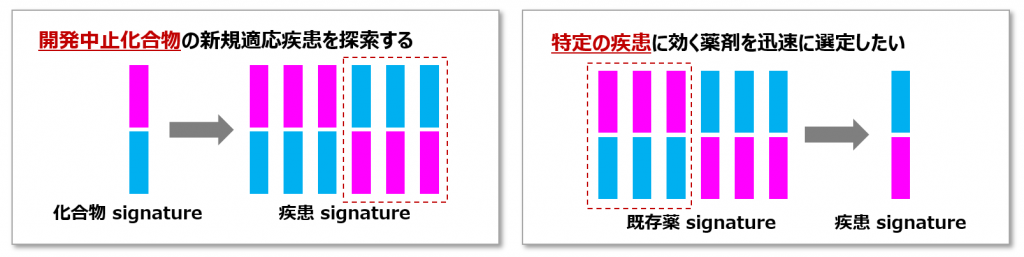 - 化合物あるいは標的ターゲット分子に特異的なgene signatureを用いて、新規適用疾患候補を抽出します。