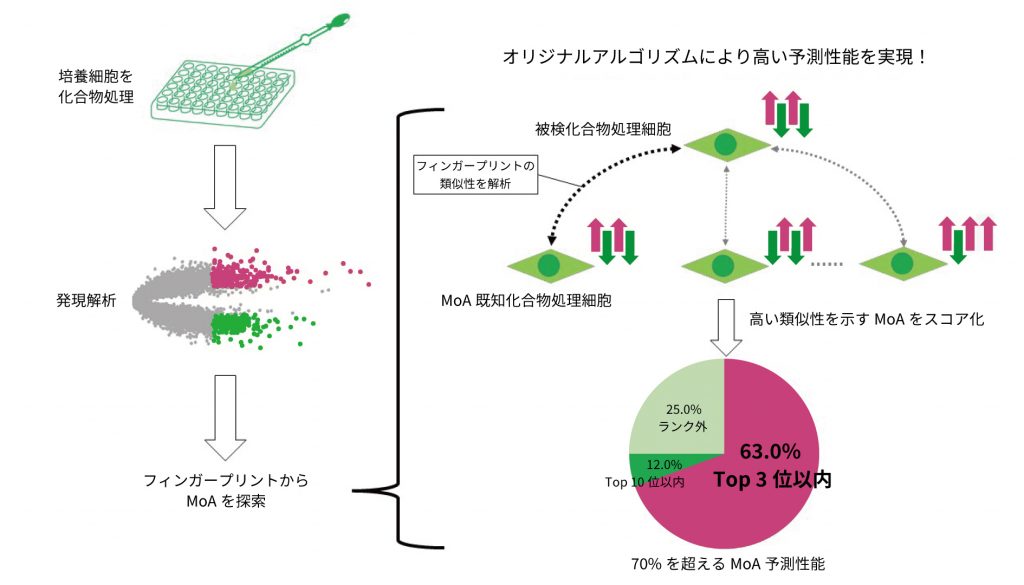 - フィンガープリンティングデータを公共データベースと比較することにより、疾患候補の抽出(ドラッグリポジショニング)およびターゲット候補の抽出(ターゲットデコンボリューション)が可能になります。