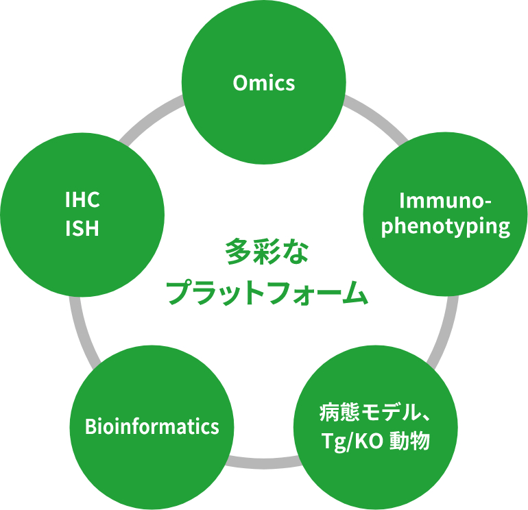 多彩なプラットフォーム Omics IHC ISH Bioinformatics 病態モデル、Tg/KO動物 Immuno- phenotyping