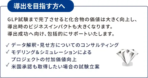 • 試験全体のマネジメントに加え、安全域の解釈や毒性課題の解決まで全面的にサポートします。