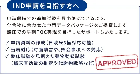 • 化合物の薬理・物性・薬物動態・安全性に関する既存データをもとに書面評価を実施し、お客様のGoal(IND申請、導出)に向けて、必要な安全性試験・サービスをパッケージ化し、ご提案します。