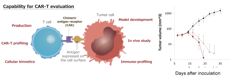 がん領域の創薬研究では細胞療法、遺伝子治療を含め、急速に治療モダリティが拡大しています。Axceleadでは低分子創薬の経験を生かし、多様なモダリティ評価の経験を蓄積しています。左図はCAR-Tによる抗腫瘍効果を評価した試験の一例となりますが、適切なモデル選択や投与レジメン検討、毒性評価を含めた試験デザインが可能です。