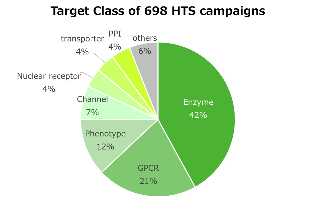 約700プロジェクトに渡り、成功確率の高いスクリーニング戦略を立案・実施してきました。ターゲットクラスも多岐に渡り、系構築やHTS実行時に課題となりやすいポイントも熟知しています。組み換え型タンパク質、安定発現細胞株などの材料調製、アッセイ系構築、HTS、各種プロファイリング、Hit expansionなど統合型のサービス提供が可能ですので、安心してヒット、リード探索をお任せください。