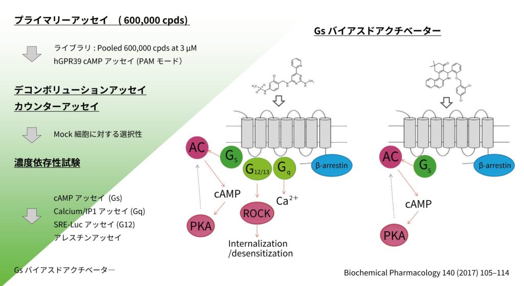 GPCR標的薬の分野では選択的にシグナルを調節することで副作用が少なく、薬効の期待できるBiased ligandsが注目されています。Axceleadは豊富な経験と実績のあるGPCR標的薬探索プラットフォームを活用してBiased ligandsなどの特徴的なプロファイルを有する化合物の探索もサポートいたします。実例としてGPR39に対するGsシグナル選択的な作動薬のヒット創出を成功させています。さらに、ヒットのプロファイリングとして種差、結合特性、Kinetics、VLPを用いたAS-MS結合などの各種の解析を実施することが可能ですので、ケモタイプの優先順位付けにも貢献いたします。