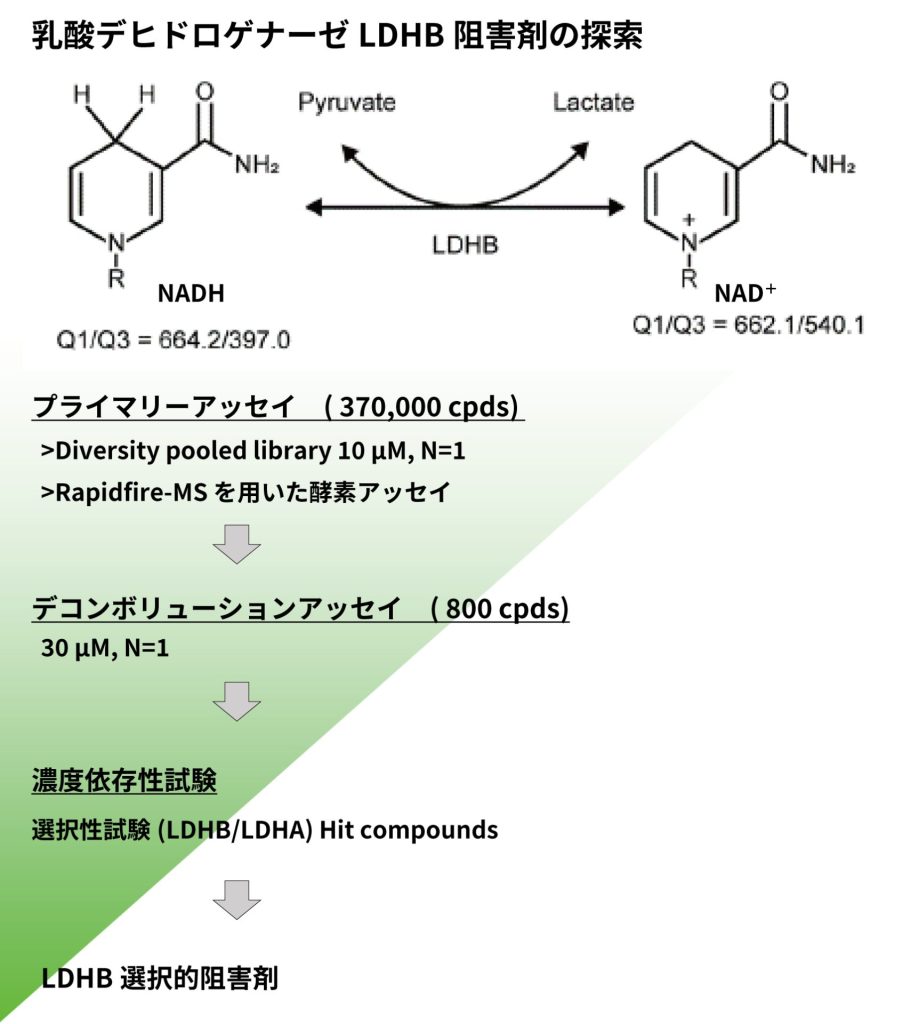 Rapidfire-MSシステムは質量分析による高速なスクリーニングを実現します。従って、これまでアッセイ系が困難であった脂質系酵素などのターゲットに対しても質量分析による検出系を構築することでロバストなHTSが可能です。Axceleadは複数のプロジェクトでRapidfire-MSシステムによるHTSからヒット創出を成功させています。一例としてNAD+およびNADHを本システムで定量することで乳酸デヒドロゲナーゼLDHB阻害薬のヒット探索を行い、世界初のLDHB選択的なアロステリック阻害剤を創出しています。
