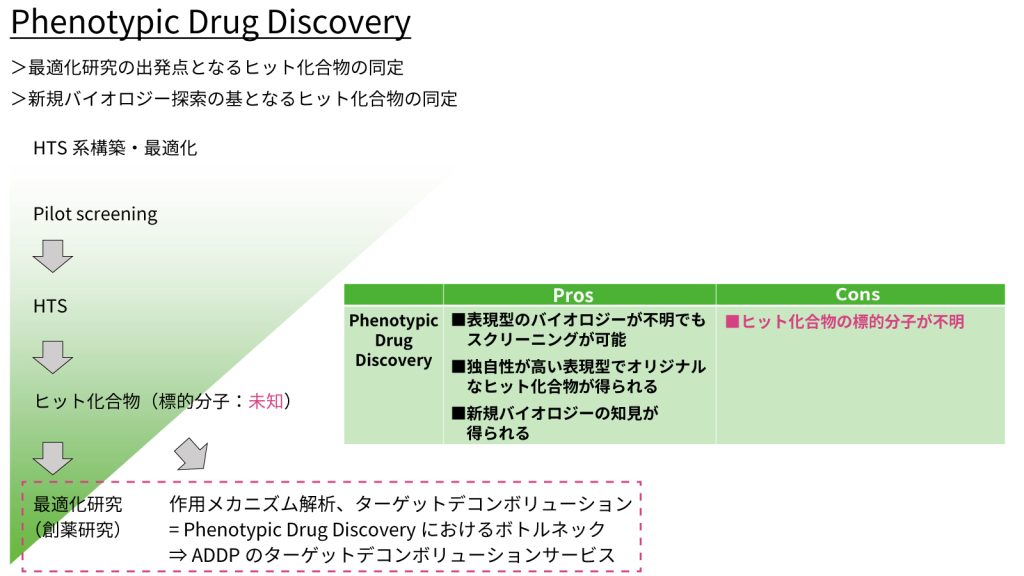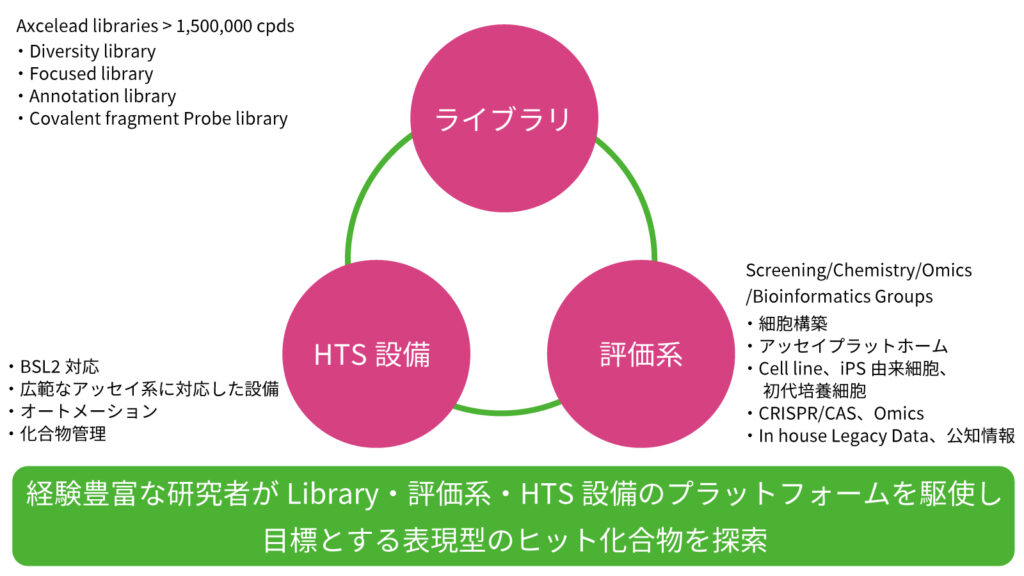- Screeningグループ、Chemistryグループ、Omicsグループ、Bioinformaticsグループの連携により、phenotypic drug discoveryのボトルネックである、HTSヒット化合物のターゲットデコンボリューションがシームレスに実施可能です。